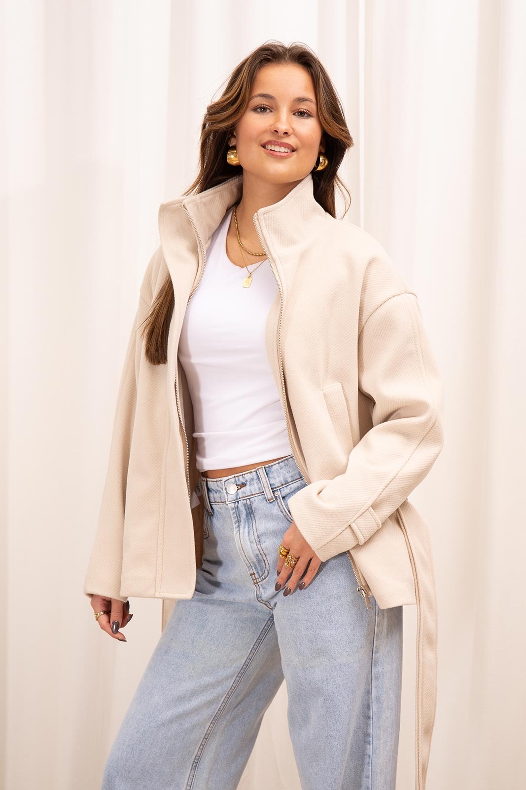 Deze beige korte trenchcoat is een stijlvolle en tijdloze toevoeging aan je garderobe. De jas heeft een ritssluiting en een hoge hals voor extra comfort. Dankzij de ceintuur in de taille creëer je een vrouwelijke, flatterende pasvorm. Perfect om te combineren met zowel casual als elegante outfits in het voor- en najaar.
