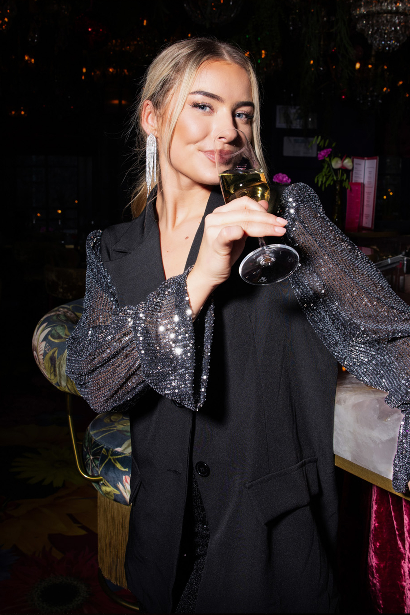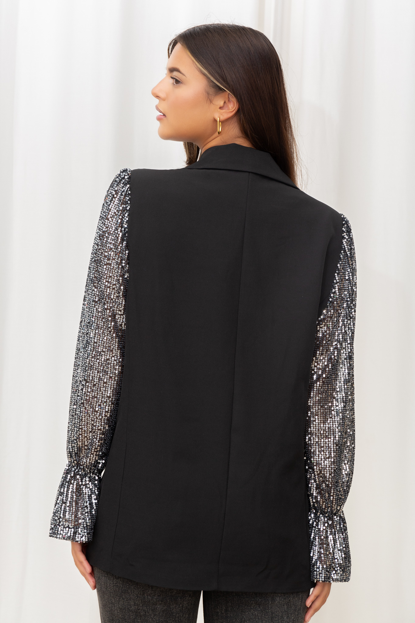 De blazer heeft zwarte glitter mouwen, een rechte pasvorm, sierzakken aan de voorkant, een kraag en knopen aan de voorkant.