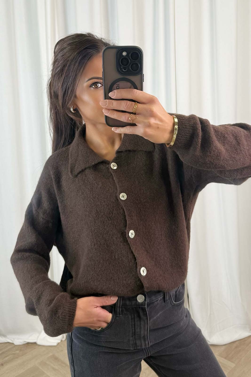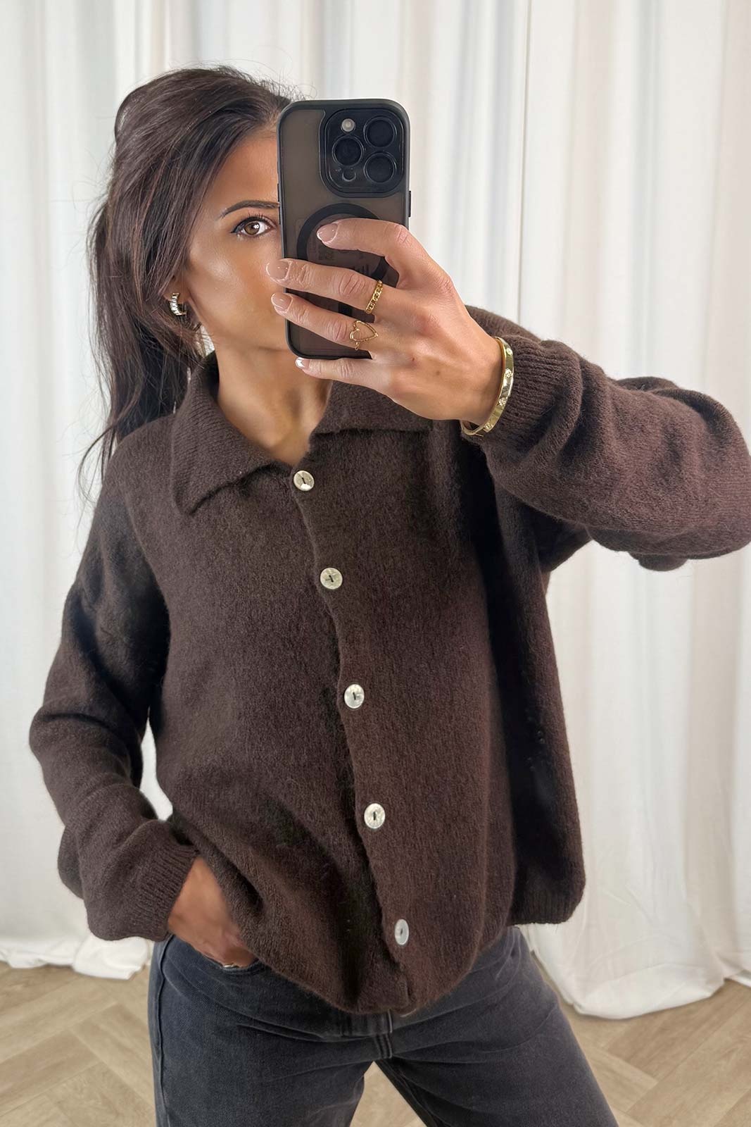 Dit bruine gebreide vest is een perfecte mix van comfort en stijl. Het vest is uitgevoerd met een klassieke knoopsluiting en een nette kraag, wat zorgt voor een verzorgde en tijdloze look. De lange mouwen maken het ideaal voor de koelere dagen. Dankzij de rechte pasvorm valt het vest losjes om het lichaam, wat zorgt voor een relaxte en flatterende uitstraling.