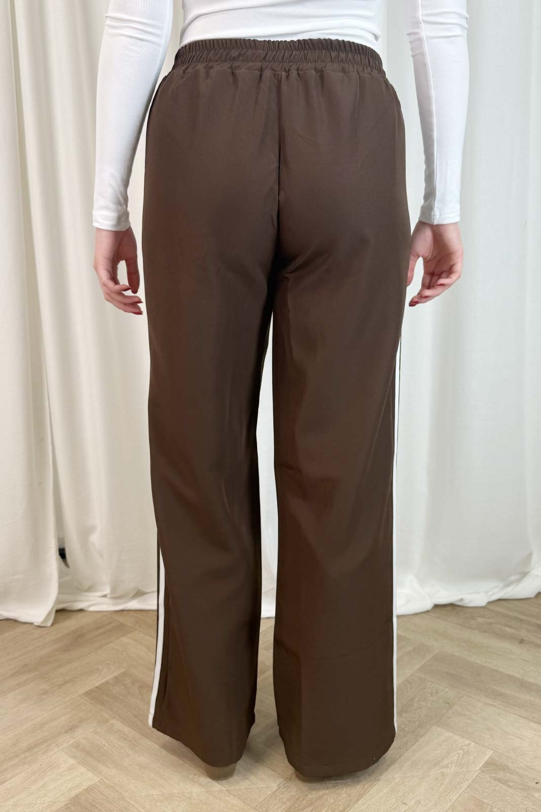 Deze stijlvolle bruine pantalon combineert comfort met een moderne look. De broek heeft een elastische tailleband die zorgt voor een comfortabele pasvorm en gemakkelijk draaggemak. Aan de zijkanten bevinden zich zakken en verticale witte strepen die het silhouet optisch verlengen en een sportieve touch geven. De wijde pasvorm valt soepel om het lichaam en creëert een elegante, trendy uitstraling.