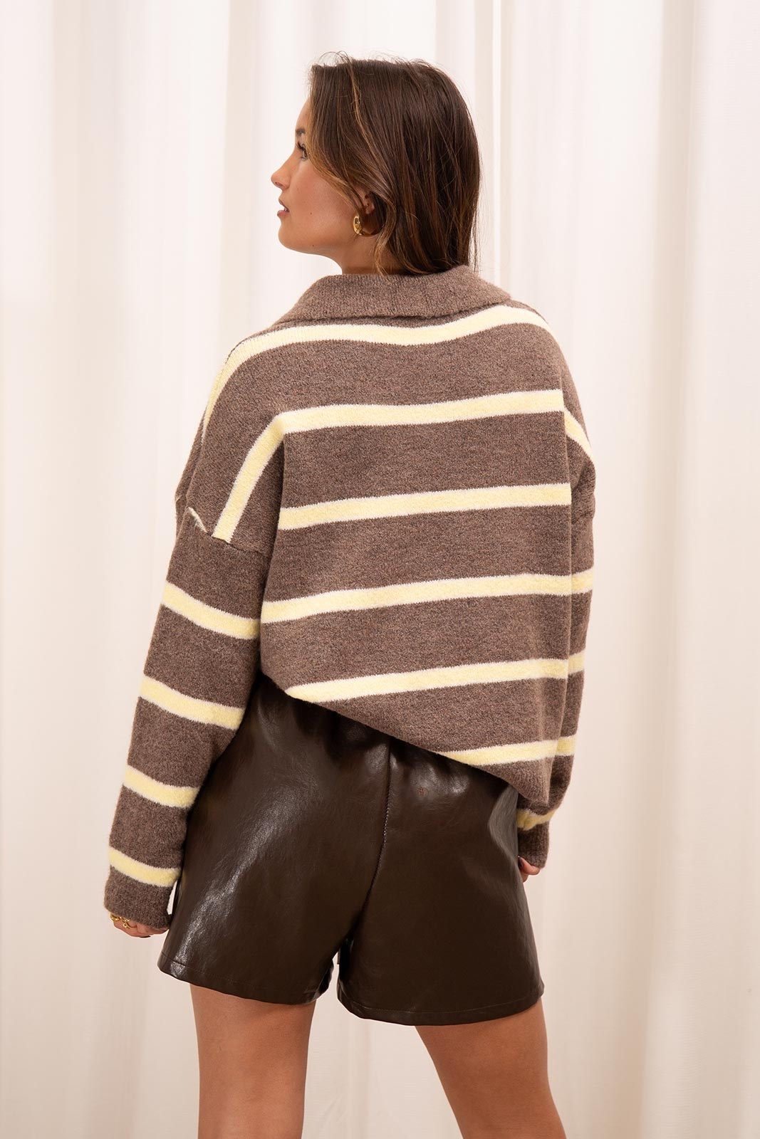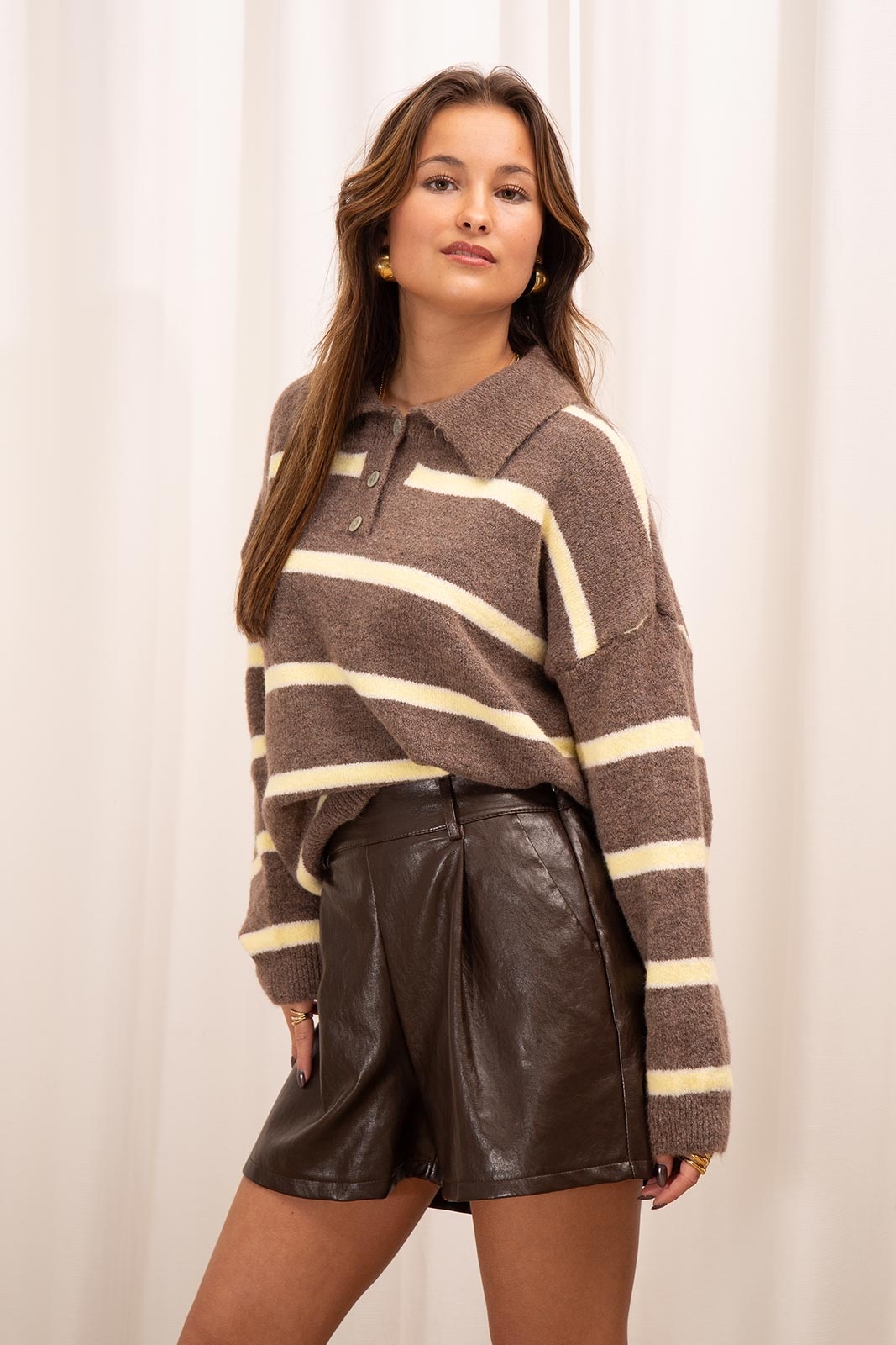 Deze bruine polo trui met gele strepen heeft een sportieve en stijlvolle uitstraling. De rechte pasvorm zorgt voor een comfortabele fit, terwijl de kraag met knopen een klassieke polo-look geeft. Perfect om casual te dragen op een jeans of te combineren met een pantalon voor een verzorgde, moderne outfit.