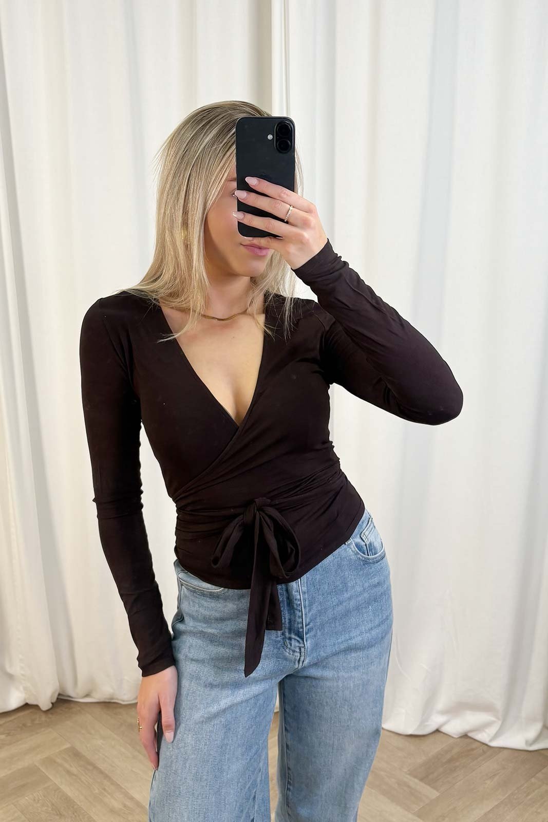 Geef je garderobe een stijlvolle upgrade met deze bruine overslag top met ceintuur. De top is ontworpen met lange mouwen en een aangesloten pasvorm, waardoor hij je figuur elegant accentueert. De overslag creëert een flatterende V-hals en dankzij de ceintuur kun je de taille extra benadrukken voor een vrouwelijke, elegante look. Combineer de top met een jeans voor een dagelijkse outfit, of draag hem met een rok of nette broek voor een meer chique stijl.