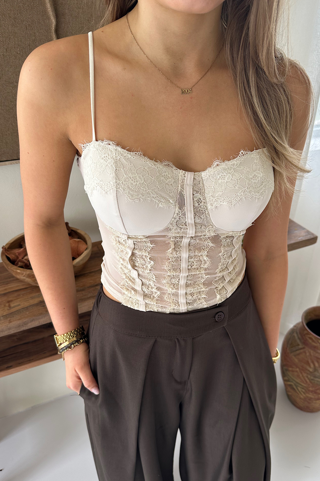 Deze elegante kanten korset top combineert stijl en comfort in één. De aangesloten pasvorm accentueert het silhouet, terwijl de cupvoering aan de binnenkant zorgt voor extra ondersteuning en een mooie vorm. Dankzij de verstelbare bandjes pas je de top eenvoudig aan voor de perfecte fit. Ideaal voor zowel een casual als een classy look.