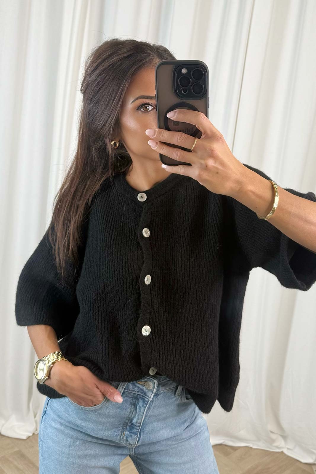 Deze zwarte gebreide top is stijlvol en comfortabel tegelijk. Voorzien van een klassieke ronde halslijn, korte mouwen en een elegante knoopsluiting aan de voorkant. De rechte pasvorm zorgt voor een flatterende look die perfect is voor elke gelegenheid. Gemaakt van een zachte, ademende stof en ideaal om te combineren met zowel jeans als rokken voor een casual of classy outfit.