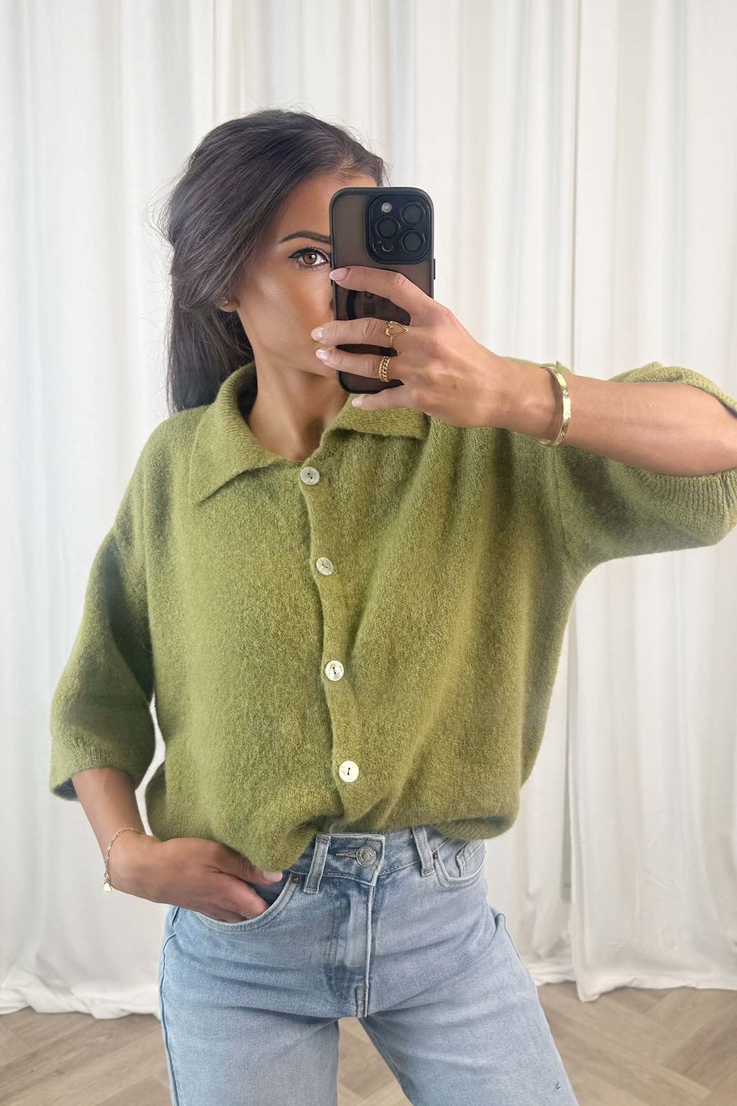 Dit groene gebreide vest is een perfecte mix van comfort en stijl. Het vest is uitgevoerd met een klassieke knoopsluiting en een nette kraag, wat zorgt voor een verzorgde en tijdloze look. De korte mouwen maken het ideaal voor het voorjaar of als laagje tijdens koelere dagen. Dankzij de rechte pasvorm valt het vest losjes om het lichaam, wat zorgt voor een relaxte en flatterende uitstraling.