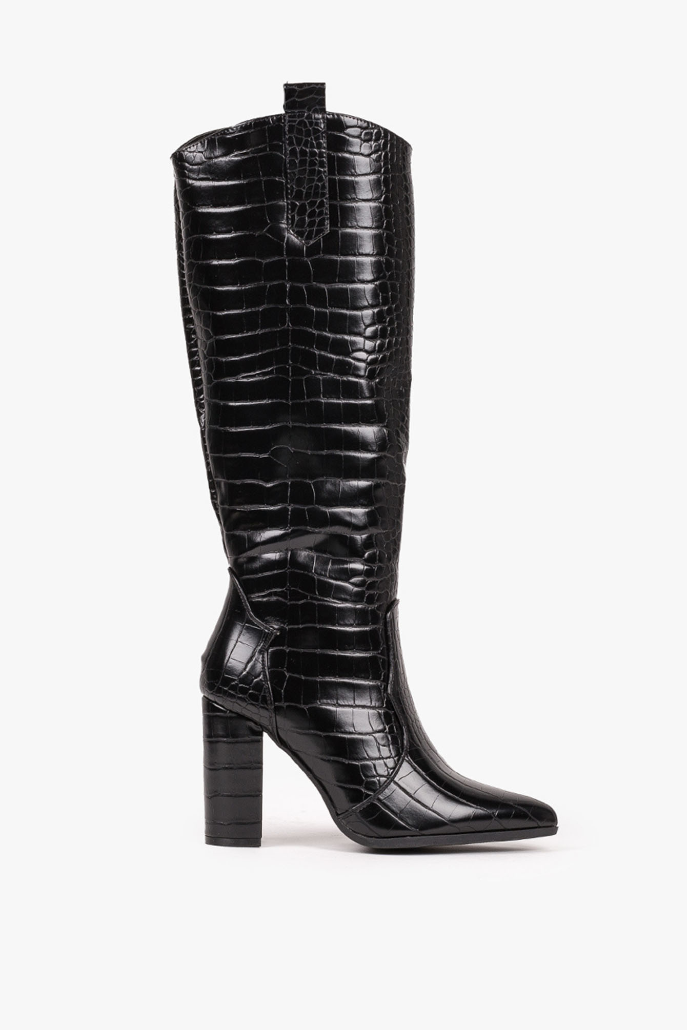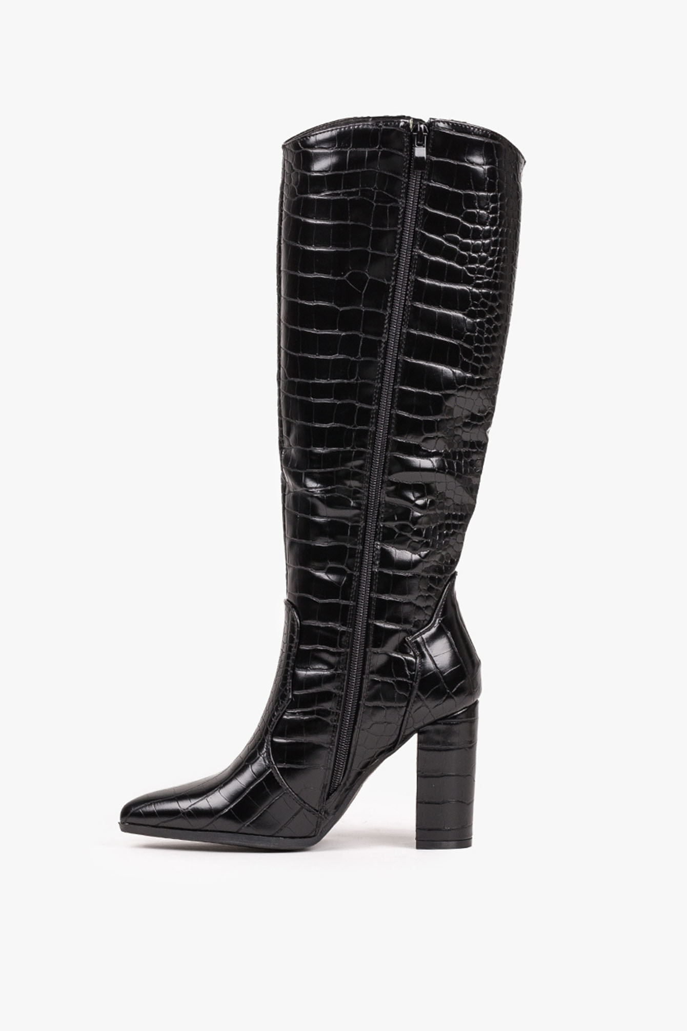 Maak kennis met de Miss Perfect laarzen dé perfecte mix van elegantie, luxe en tijdloze stijl. Deze hoge laarzen zijn uitgevoerd in stijlvol krokodillen kunstleer en hebben een spitse neus voor een verfijnde, vrouwelijke uitstraling. De stevige blokhak van 9 cm zorgt voor extra lengte zonder in te leveren op comfort.