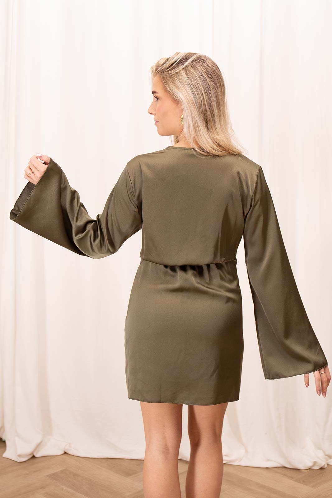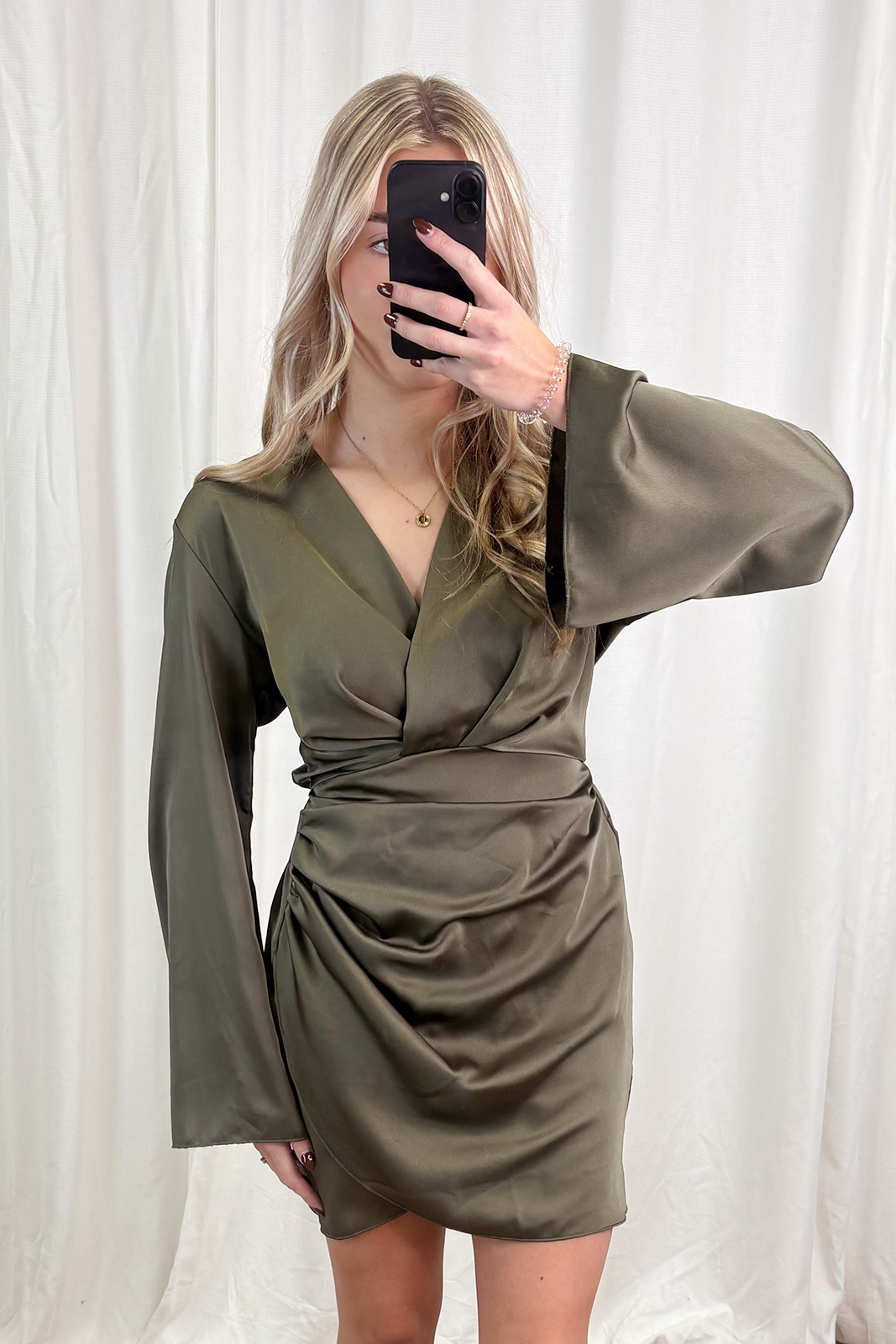 Deze elegante olijf groene satijnen jurk straalt tijdloze klasse uit en is perfect voor zowel feestelijke gelegenheden als een stijlvolle avond uit. De jurk is gemaakt van zacht, glanzend satijn dat soepel om het lichaam valt. De lange, wijd uitlopende mouwen zorgen voor een vrouwelijke look. De V-hals creëert een mooi, open decolleté, terwijl de elastische taille de pasvorm flatteert en de jurk subtiel vormgeeft. Het overslagdetail aan de voorzijde voegt een chique en speels accent toe.