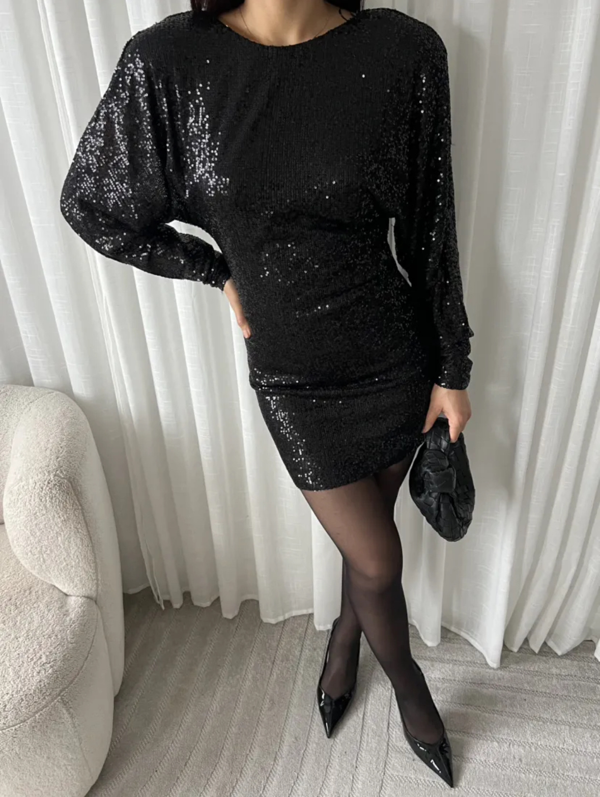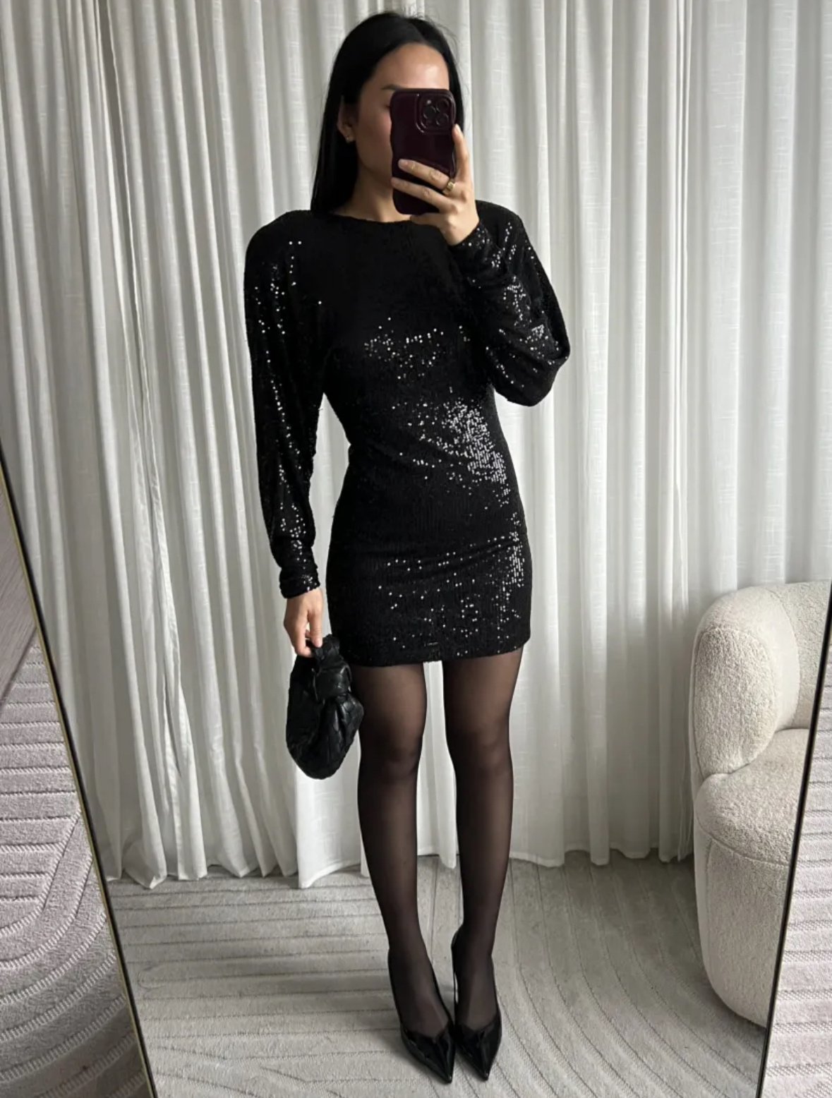 Deze zwarte jurk met mini pailletten is een echte eyecatcher voor iedere feestelijke gelegenheid. De jurk is volledig bezet met glanzende pailletten. Dankzij de aangesloten pasvorm wordt je silhouet elegant geaccentueerd, terwijl de lange mouwen een stijlvolle en chique balans creëren. Een bijzonder detail is de open rug, die de jurk een verfijnde en vrouwelijke twist geeft. De subtiele schoudervulling zorgt voor een mooie gecentreerde houding. Of je nu naar een feest, diner of speciale gelegenheid gaat, deze bruine paillettenjurk combineert glamour en elegantie in één tijdloos ontwerp. Perfect te stylen met hoge hakken en minimalistische sieraden voor een complete, sophisticated look.