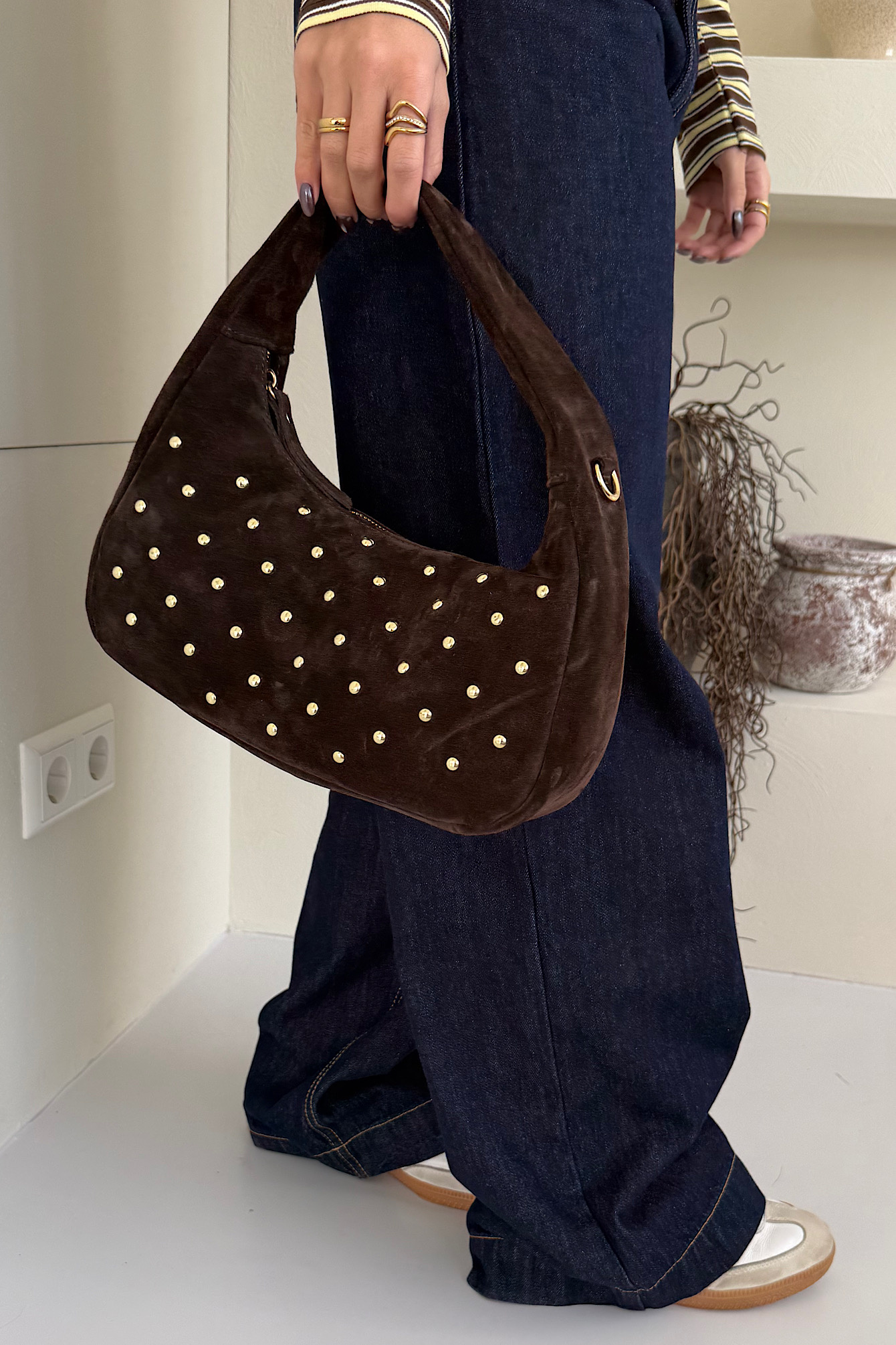 Deze stijlvolle bruine suède handtas is verfijnd afgewerkt met goudkleurige studs, die een luxe en moderne uitstraling geven. Dankzij de stevige ritssluiting blijft de inhoud veilig opgeborgen, terwijl het compacte ontwerp toch voldoende ruimte biedt voor al je dagelijkse essentials. Aan de binnenkant beschikt de handtas over een handig ritsvakje. Het zachte suède materiaal voelt comfortabel aan en geeft de tas een tijdloze, hoogwaardige look.