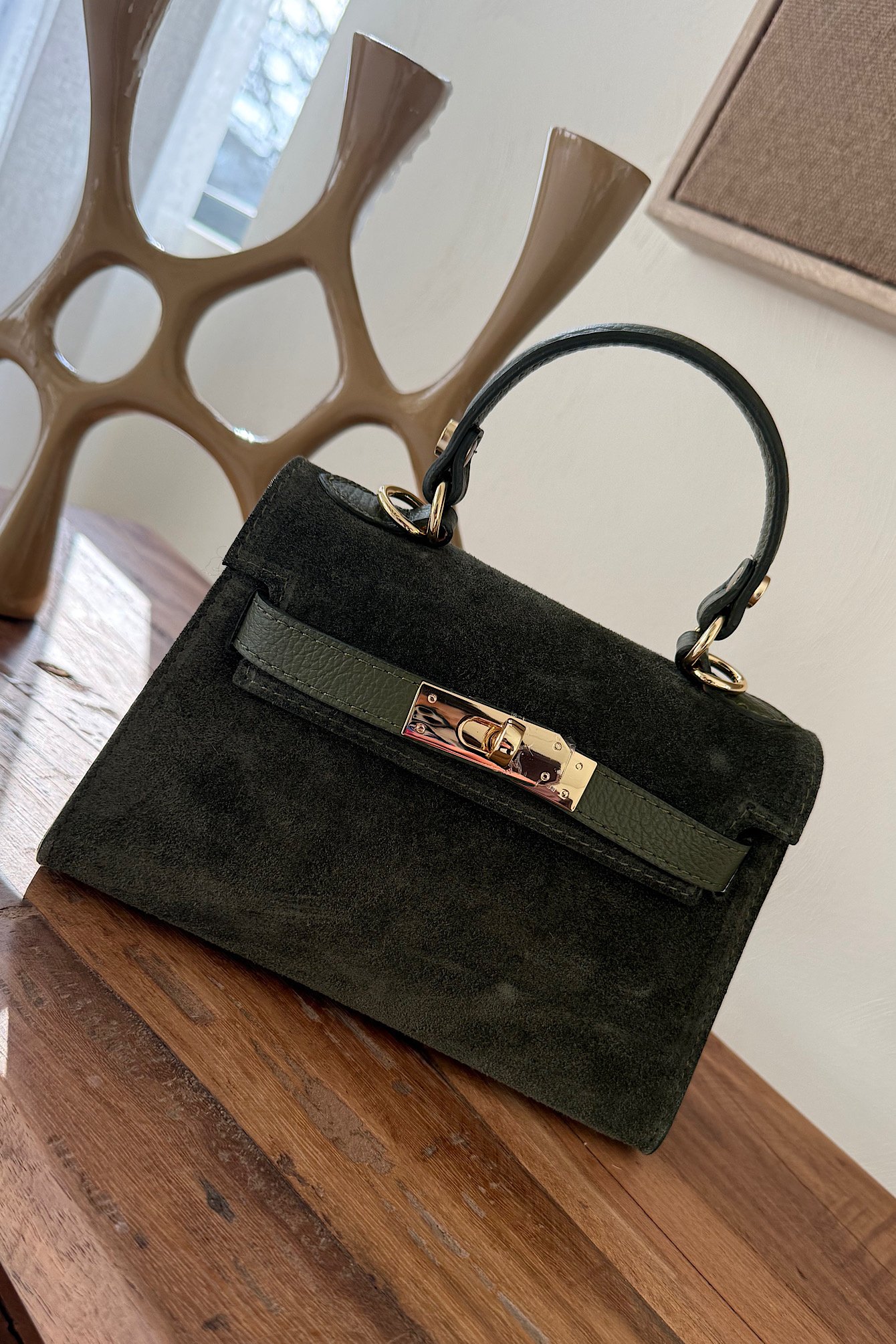Deze elegante suède tas combineert een luxe uitstraling met praktisch gebruiksgemak. De stijlvolle draaisluiting en goudkleurige hardware geven de tas een chique, tijdloze look. Dankzij het afneembare en verstelbare hengsel draag je de tas zoals jij wilt, als schoudertas of comfortabel als crossbody tas. Perfect voor dagelijks gebruik of een avondje uit.