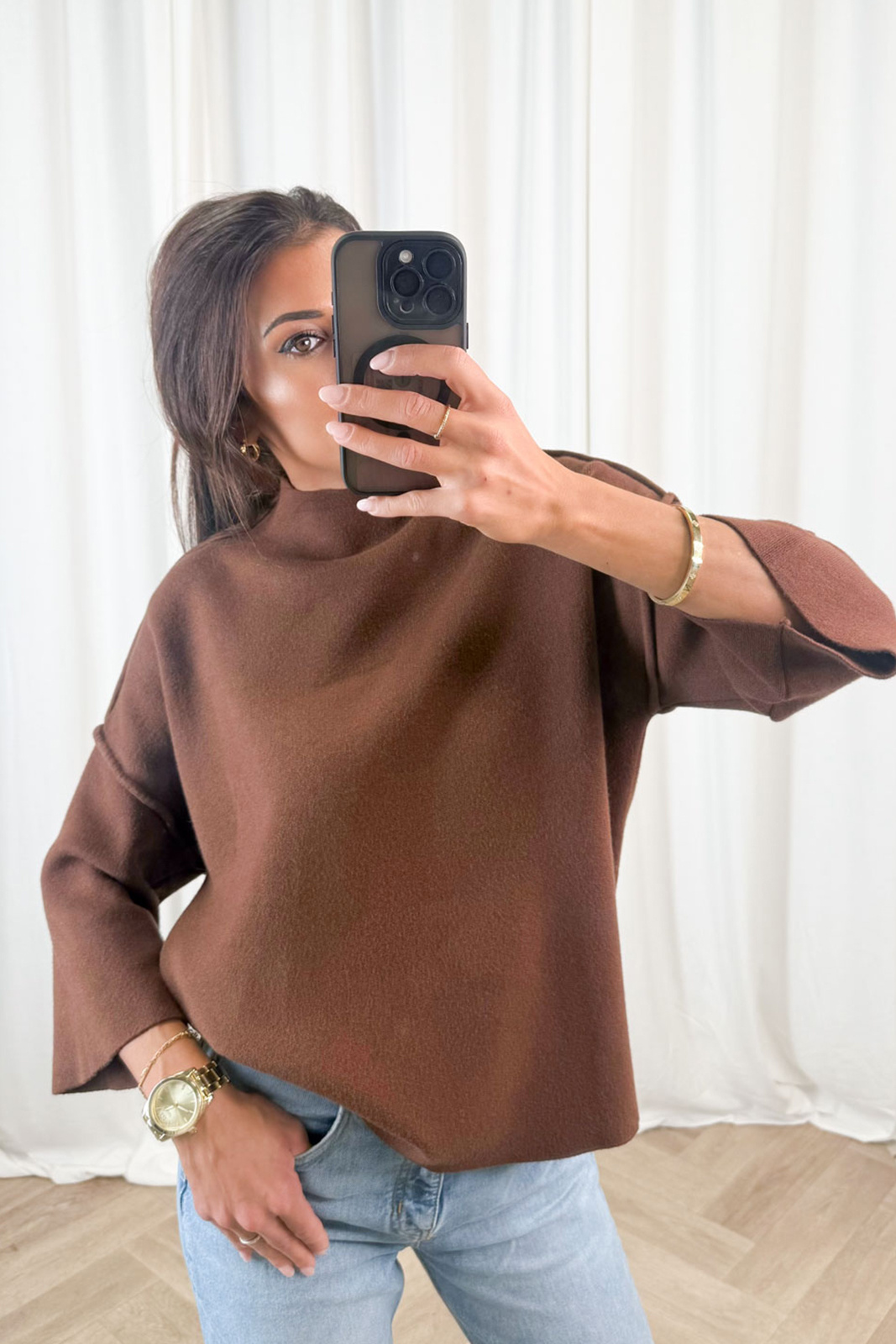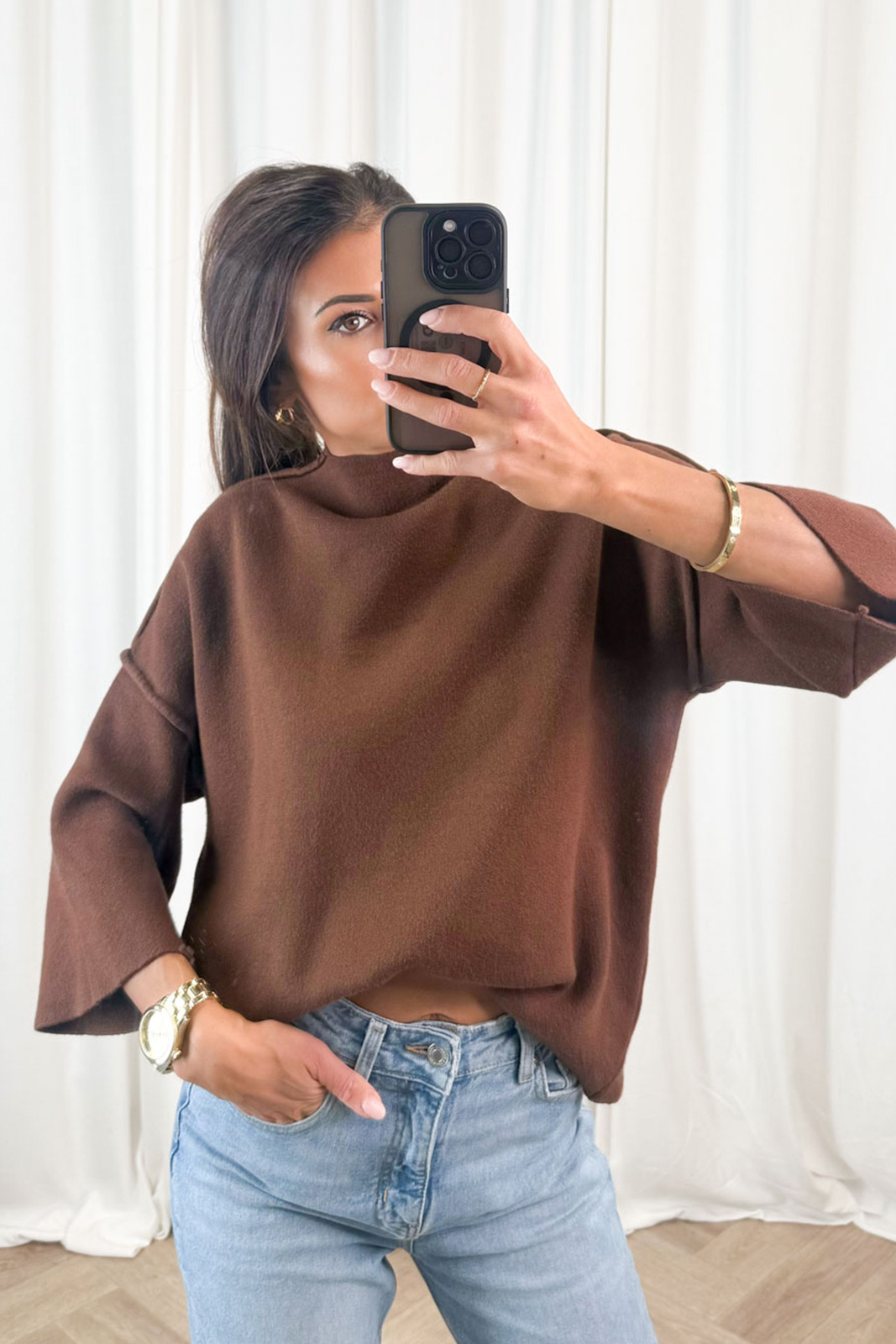 Deze bruine gebreide top is een perfecte combinatie van comfort en stijl. De hoge hals geeft een elegante uitstraling, terwijl de rechte pasvorm zorgt voor een moderne, flatterende look. De driekwart mouwen maken de top geschikt voor elk seizoen en geven een subtiele, verfijnde touch. Combineer deze veelzijdige top moeiteloos met een jeans, rok of pantalon voor een tijdloze en stijlvolle outfit.