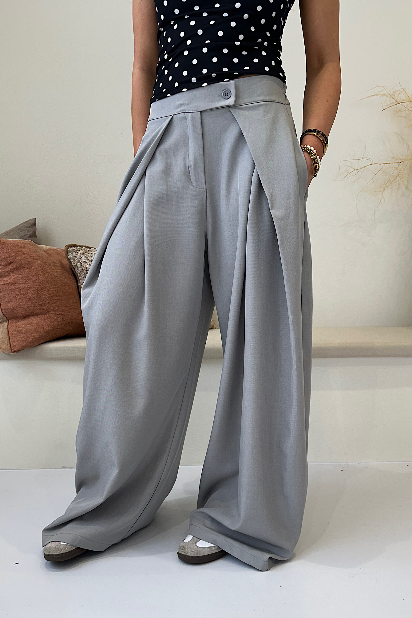 Grijze pantalon met een elegante, wijde pasvorm die zorgt voor een moderne en comfortabele uitstraling. De subtiele plooien aan de voorzijde geven de broek een verfijnde en stijlvolle look, terwijl de steekzakken praktisch gemak bieden. Voorzien van een klassieke rits- en knoopsluiting voor een nette afwerking en een perfecte pasvorm. Ideaal te combineren voor zowel zakelijke als casual outfits en een tijdloze toevoeging aan elke garderobe.