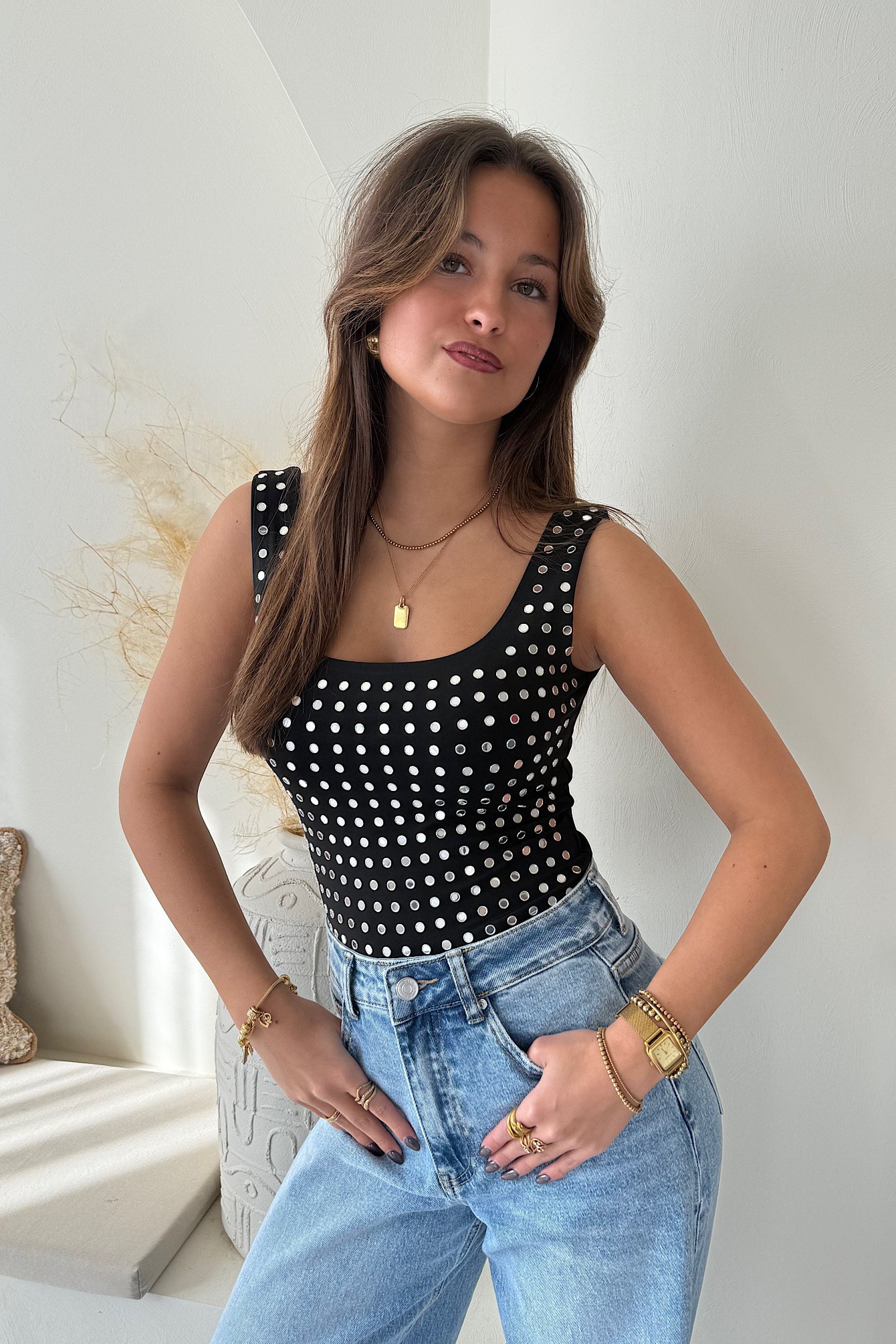 Deze zwarte body met studs geeft jouw outfit een stoere en vrouwelijke uitstraling. De aangesloten pasvorm accentueert je silhouet en zorgt voor een mooie, flatterende fit. De body is voorzien van een praktische sluiting met drukknopen aan de onderzijde, wat zorgt voor extra draagcomfort. Perfect om te combineren met een jeans, rok of leren broek voor een krachtige en stijlvolle look.