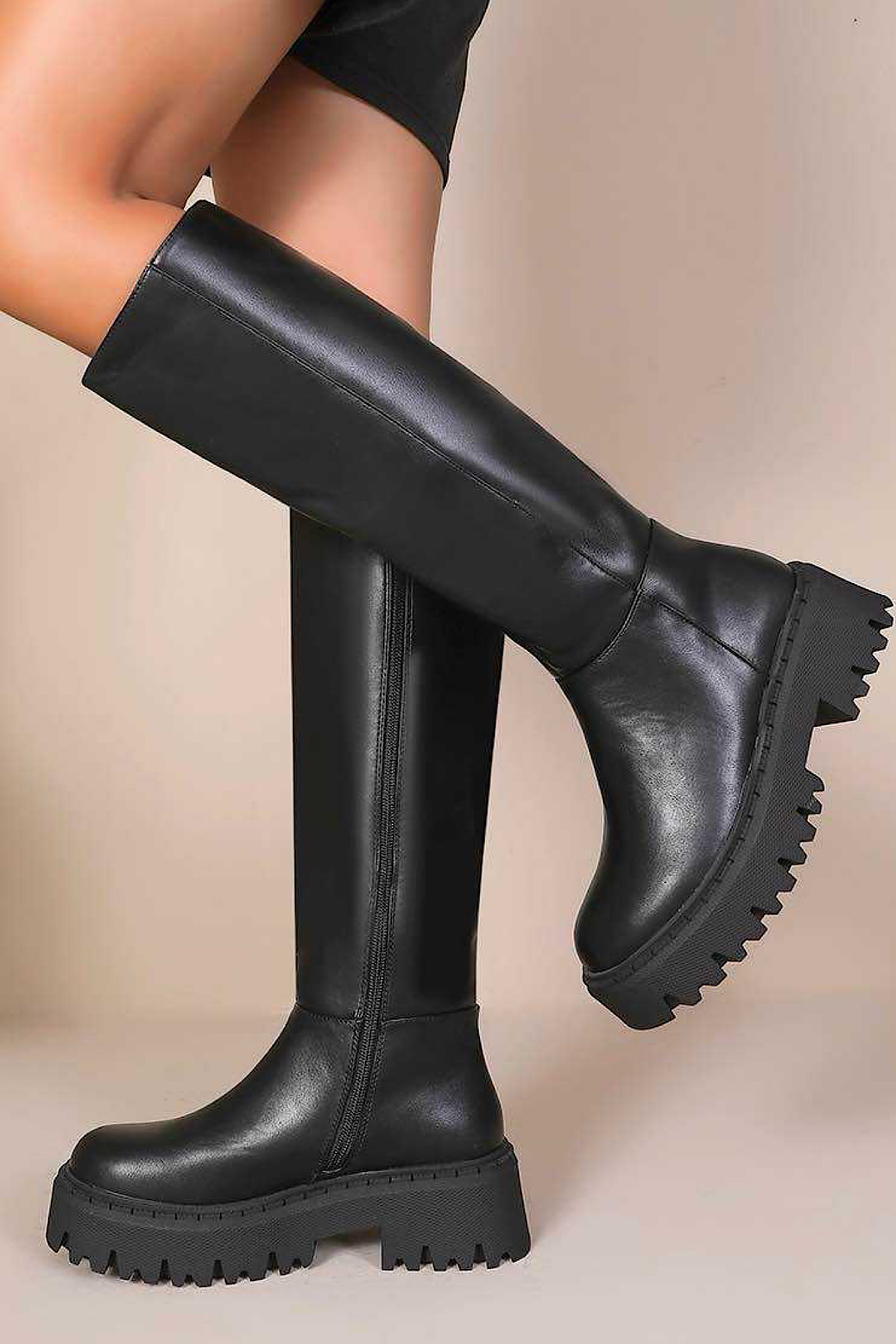 Maak een statement met deze zwarte hoge laarzen met trendy platform look. Gemaakt van stevig PU-leer en afgewerkt met een ronde neus voor een moderne, stoere uitstraling. Dankzij de ritssluiting aan de binnenkant trek je de laarzen makkelijk aan en uit. De comfortabele pasvorm en stevige zool maken deze laars perfect voor dagelijks gebruik en stijlvolle gelegenheden.
