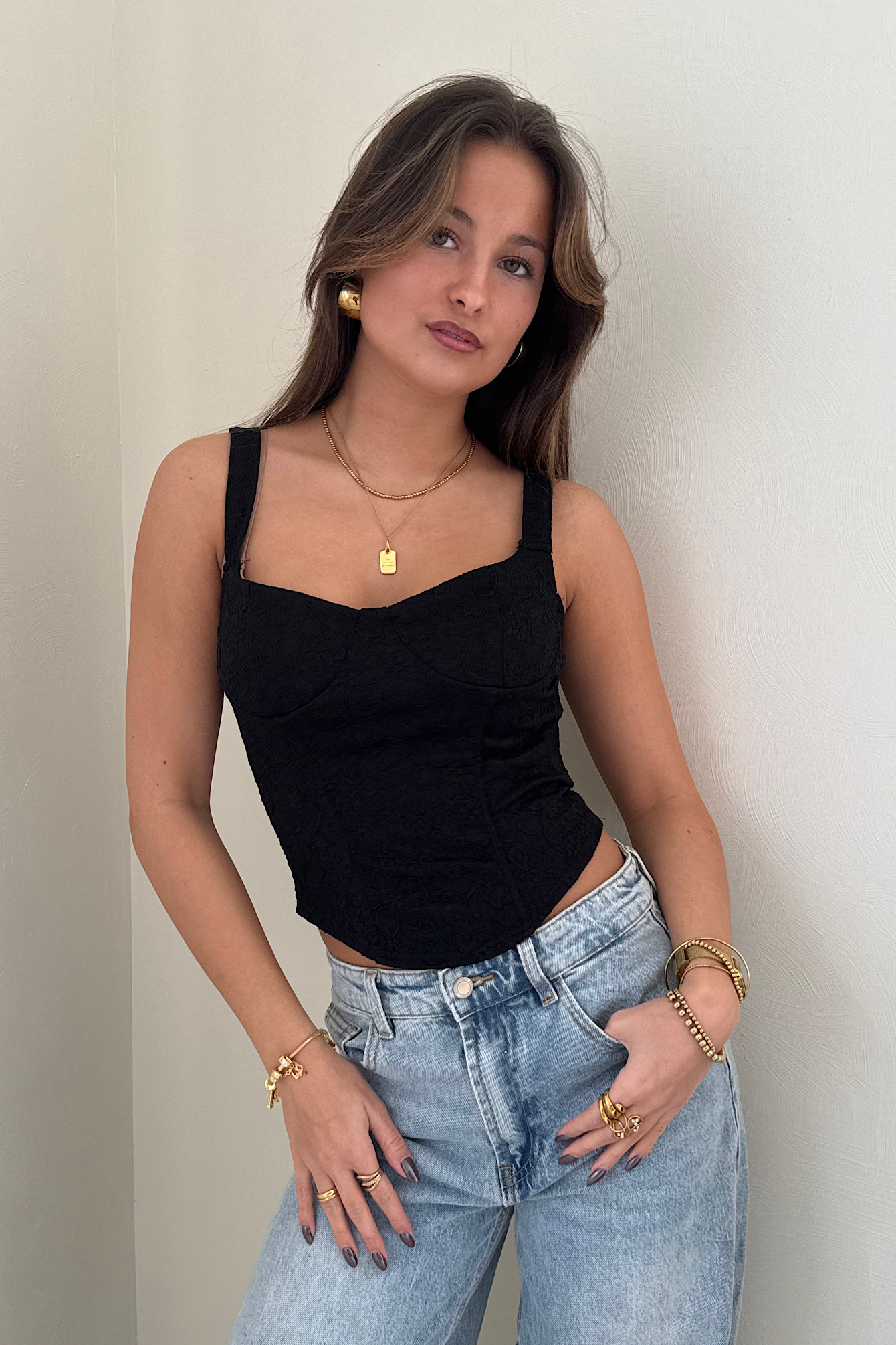 Deze zwarte korset top met verfijnd bloemen kant motief combineert elegantie met een vrouwelijke, moderne uitstraling. De aangesloten pasvorm accentueert je taille en volgt mooi de contouren van je lichaam, waardoor een flatterend silhouet ontstaat. Perfect voor een avondje uit of een stijlvolle dagelijkse look. Combineer met een high waisted jeans voor een trendy outfit of draag met een rok en hakken voor een chique uitstraling.
