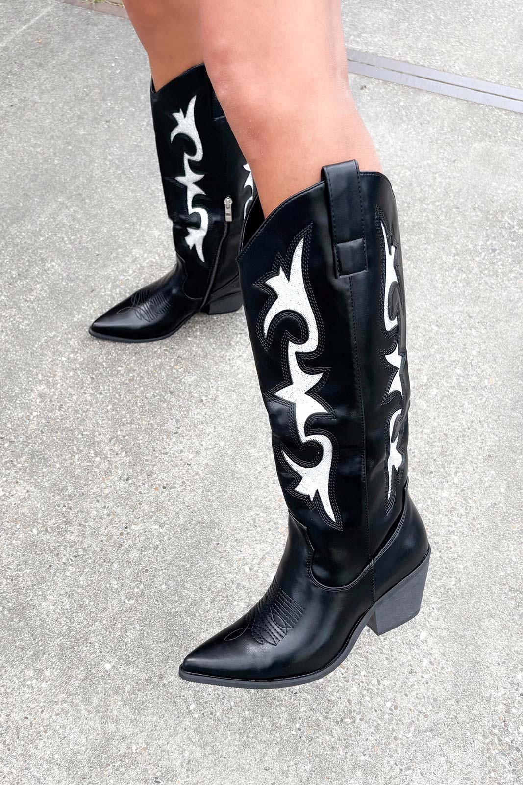 Zwarte cowboylaarzen dames – PU leer, witte details en western stijl