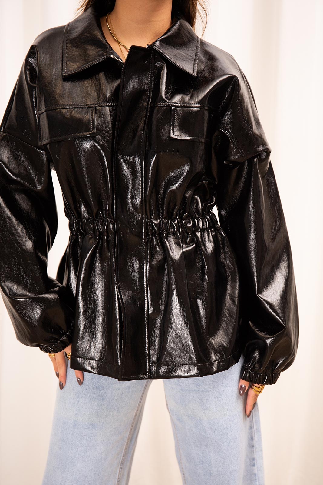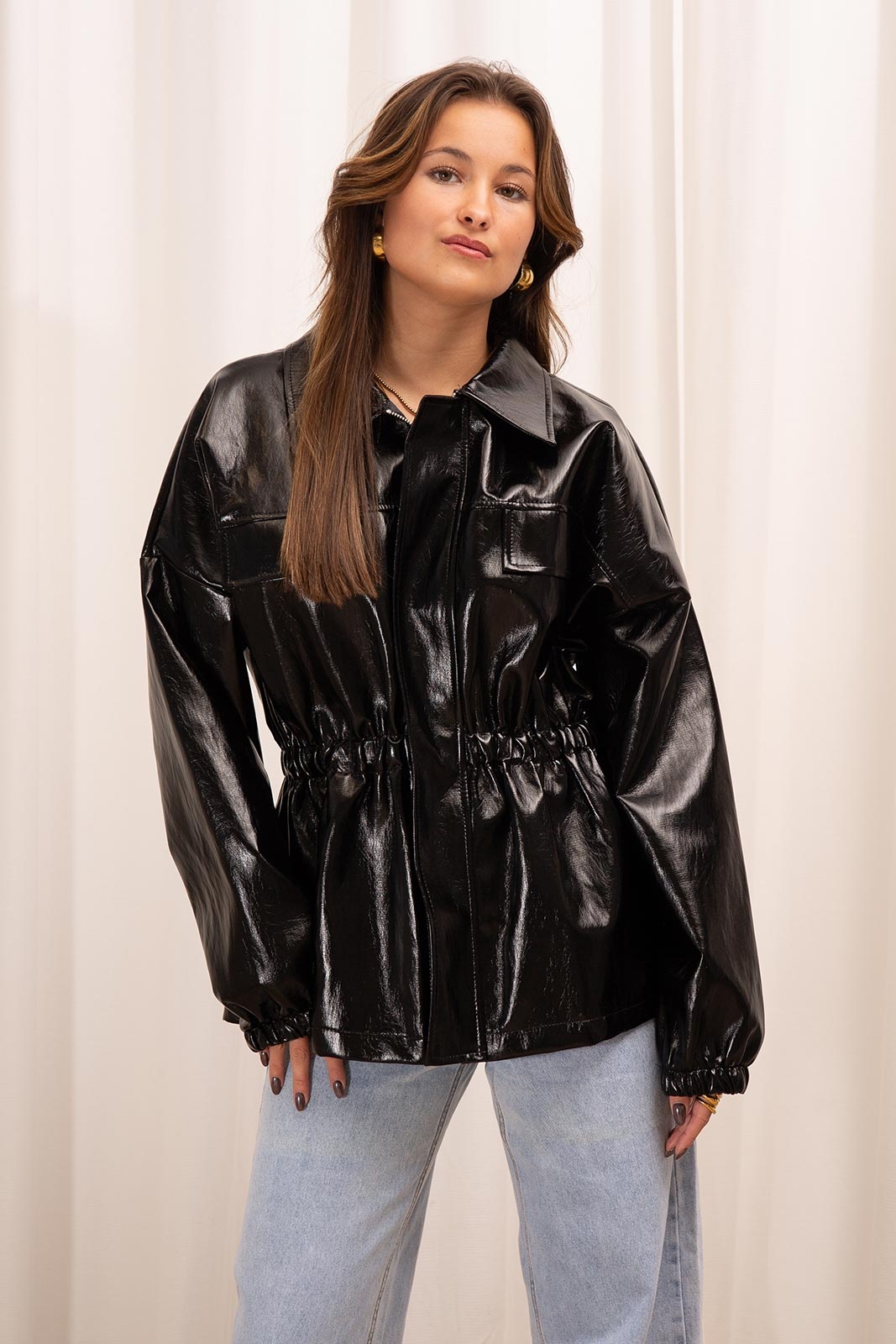 Trendy zwarte PU lak jas met een stijlvolle glanzende finish. Voorzien van een stevige ritssluiting aan de voorkant, een klassieke kraag en een elastische taille die zorgt voor een flatterende pasvorm. Perfect om je outfit een edgy en moderne uitstraling te geven.
