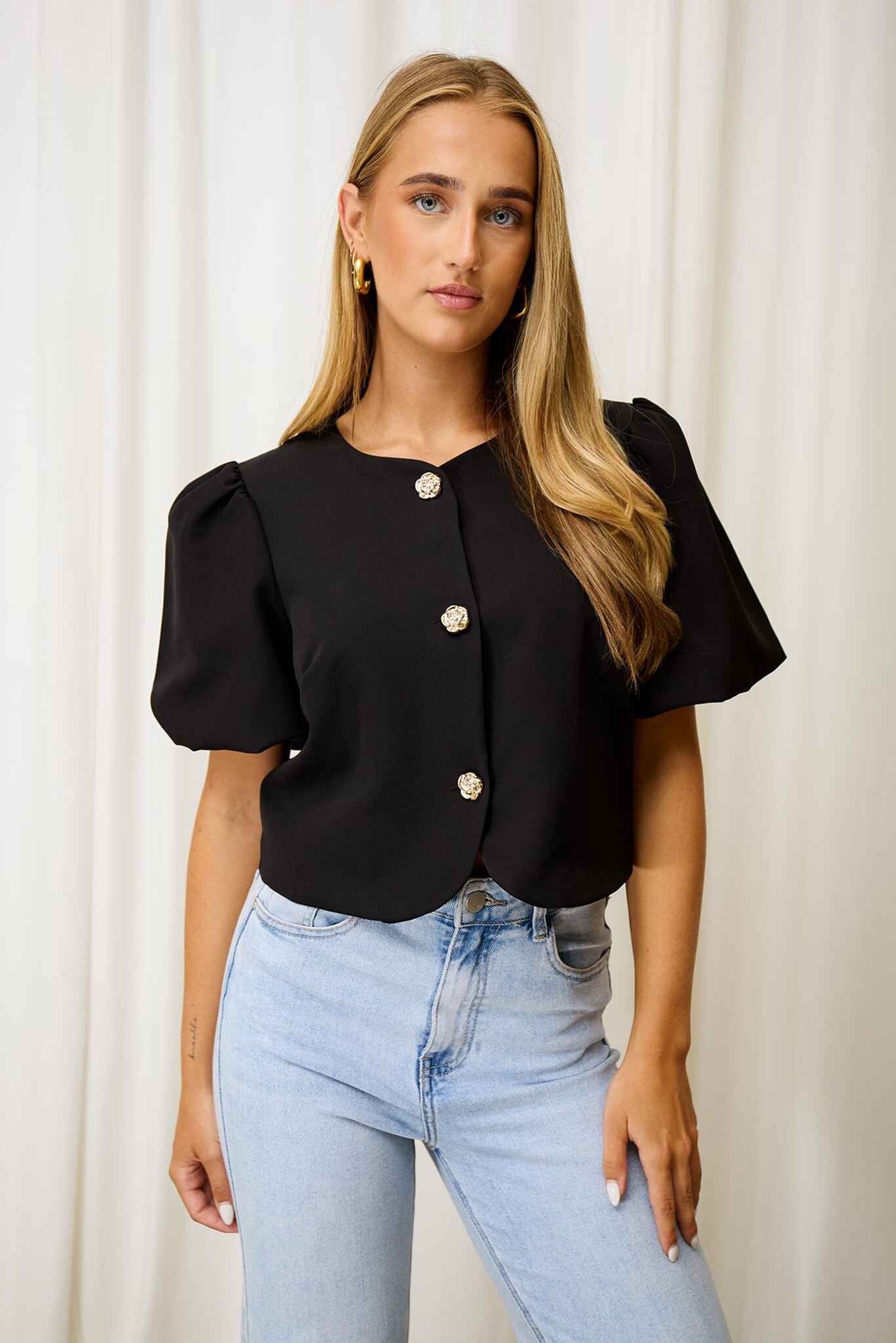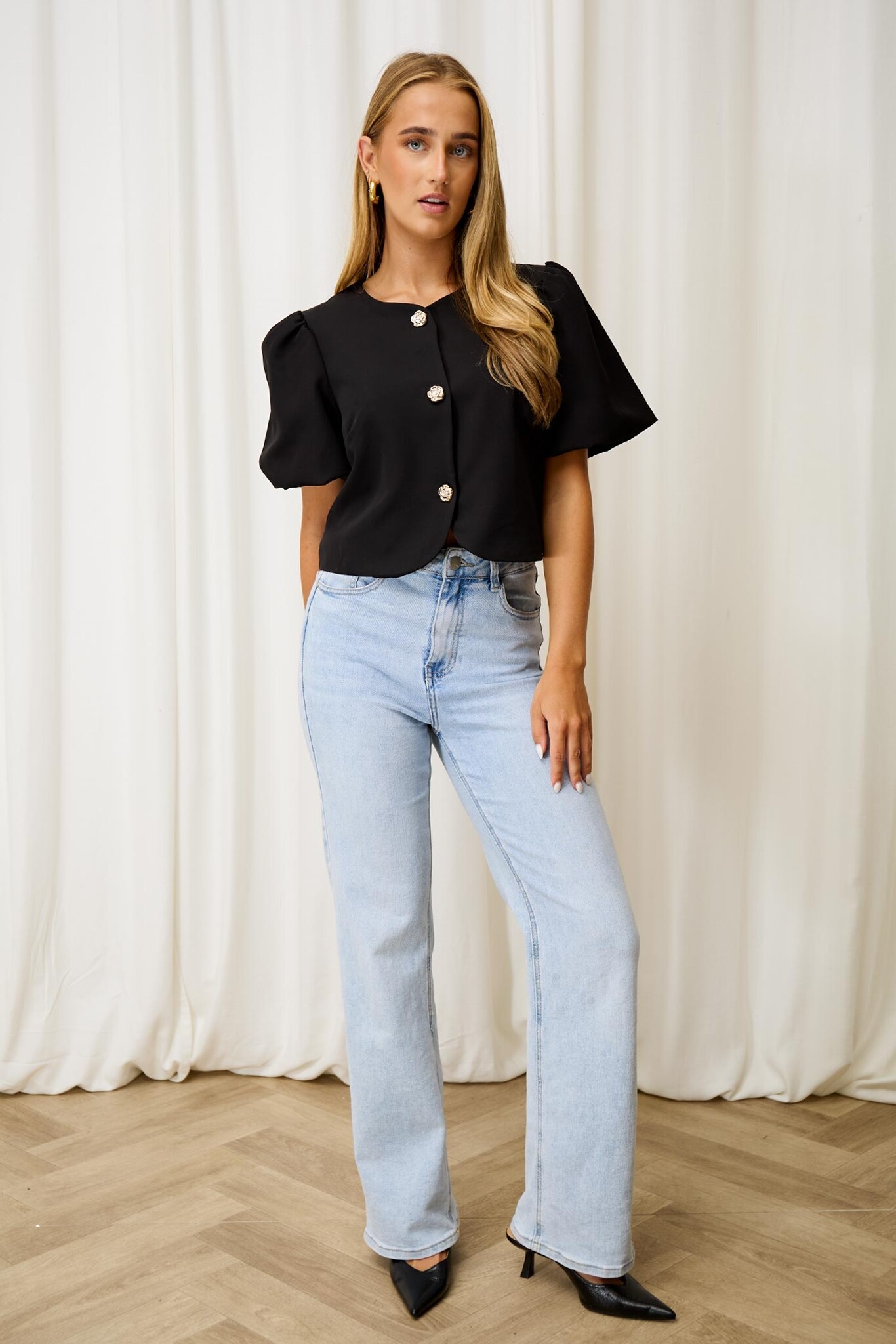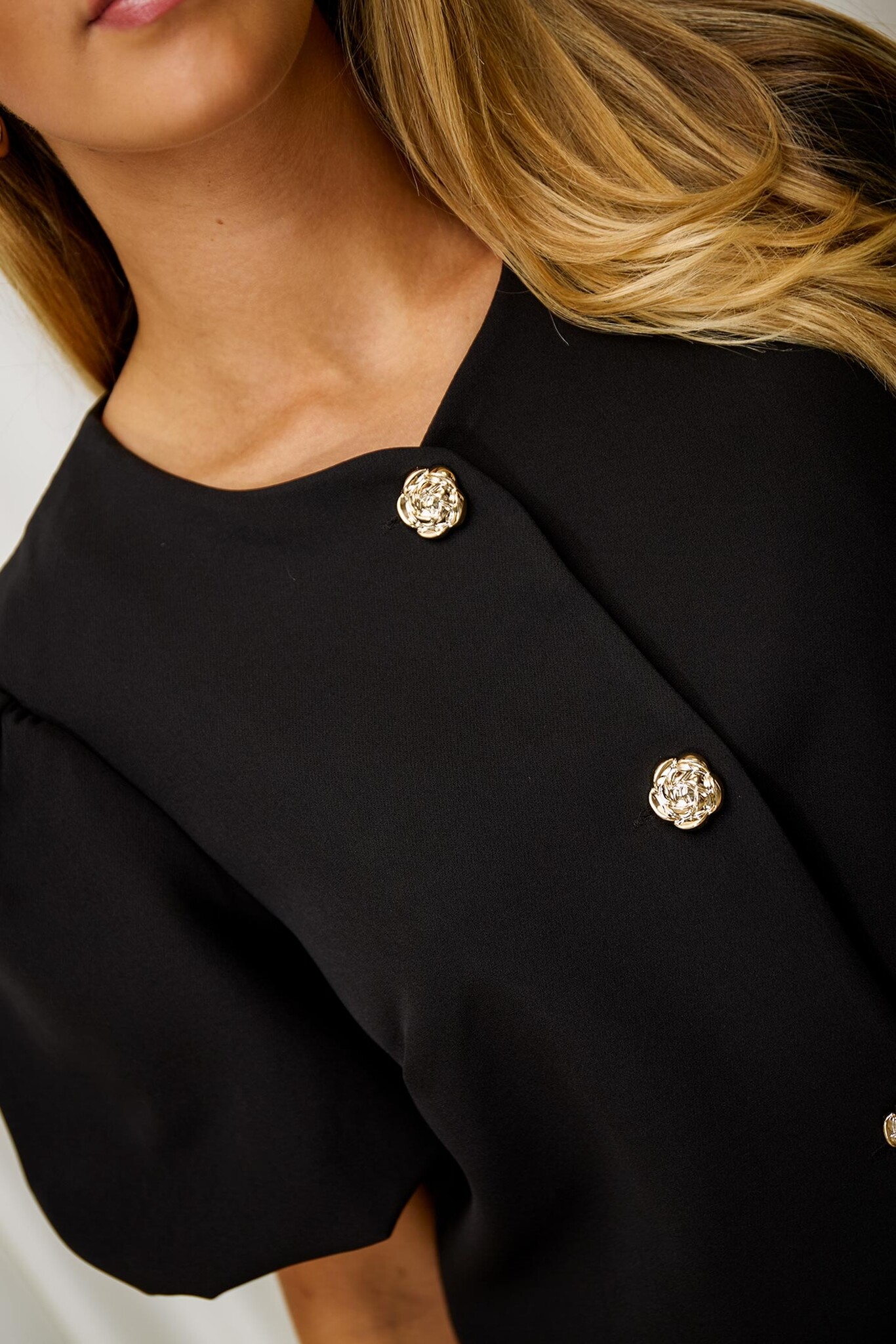 Deze elegante zwarte top is een veelzijdige toevoeging aan je garderobe. De korte pofmouwen en de ronde halslijn geven het item een vrouwelijke en verfijnde uitstraling. Aan de voorkant zorgen de subtiele gouden knopen voor een chique detail dat de top net dat beetje extra geeft. Dankzij de rechte pasvorm zit de top comfortabel en is hij makkelijk te combineren.